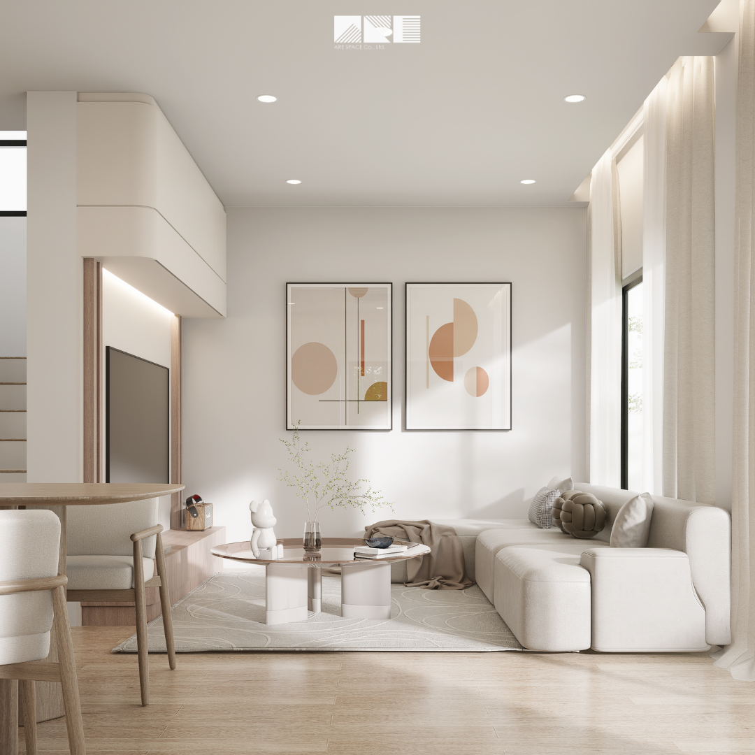 An essential living space by soft tones natural textures and hidden storage designed for everyday comfort and clarity